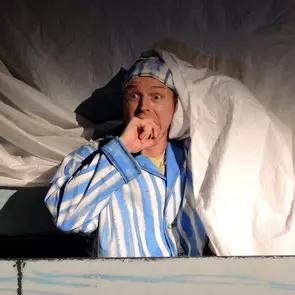 Viktor (Robsrud & DeaN) ⚪ ⚫ ⚫ Se alle bilder, videoer, lydklipp, vedleggViktor er et klovneaktig stykke som handler om det å være redd og hvordan vennskap kan hjelpe med å løse problemer. Viktor er en gutt/mann som er redd for alt. Spesifikt er han redd for bokstaven «V» noe som tilsier at han er redd for hele Verden og hans eget navn Viktor. Derfor har han laget sin egen verden i køyesengen sin, som han aldri forlater. I sengen har han både, bibliotek, hage, kjøkken, piano, svømmehall, tog, buss, fly og spagetti (som han elsker). Plutselig en dag hører han et dunk på loftet. Det er pingvinen som aldeles ikke heter Viktoria - som kommer på besøk og setter Viktors liv på hodet. Viktor er en underfundig, melodisk og magisk forestilling hvor barna tilslutt får møte Viktor som, med pingvinens hjelp, våger å forlate sin lille verden og hilse på publikum. Forestilling ble produsert i samarbeid med Unge Viken teater. Om utøvere og produsenter![]()